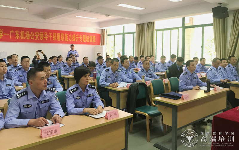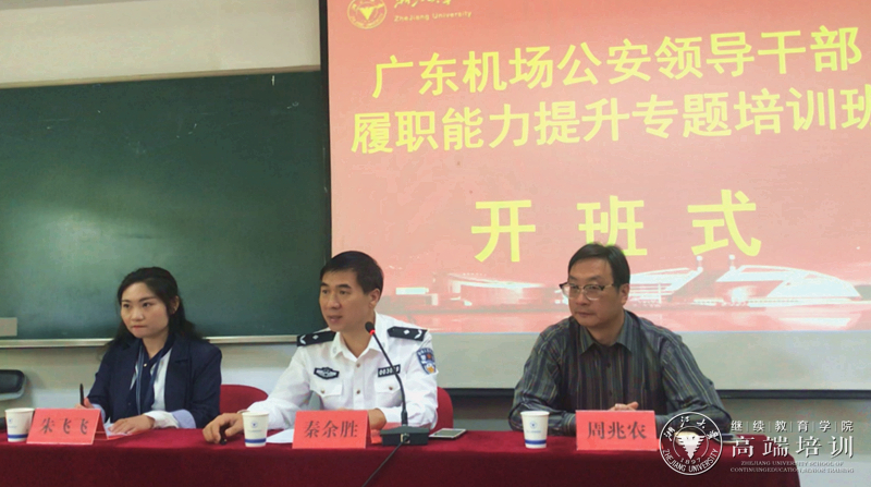 5月7日上午,由广东省公安厅机场公安局委托,浙江大学继续教育学院承办的“广东机场公安领导干部履职能力提升专题培训班”在华家池校区举行开班式。广东省公安厅机场公安局党委委员、警务指挥处处长秦余胜,浙江大学继续教育学院副院长(兼)、纪委书记,全国干部教育培训浙江大学基地副主任周兆农出席开班式,来自广东机场公安局的50名学员参加了本次培训。