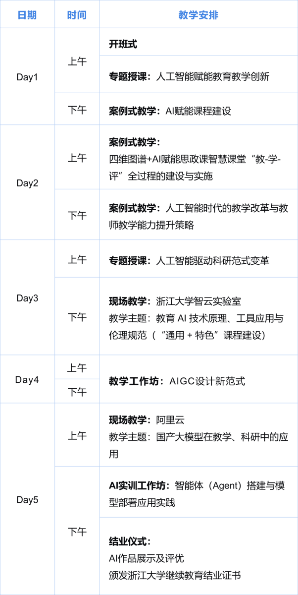 依托浙江大学 AI 学科基础与教育教学实践经验,叠加阿里云大模型、智能体等前沿技术优势,确保培训内容的专业性与前沿性。