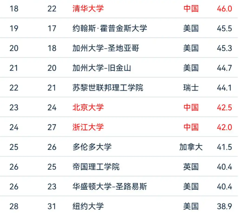 清华大学首次跻身世界前20,排名全球第18,位列亚洲第一,北京大学排名第23,浙江大学排名第24,上海交通大学排名第30,中国科学技术大学排名第40,复旦大学排名第41,中国前五名高校的世界排名相比去年均有不同程度的提升。