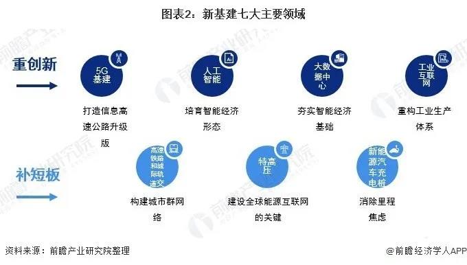 根据中央系列重要会议和文献的相关表述,结合当前中国科技和经济社会发展状况,业内人士和媒体机构将新基建涉及的主要领域归纳为7个方面,即5G基建、人工智能、大数据中心、工业互联网、城际高速铁路和城际轨道交通、特高压、新能源汽车充电桩。