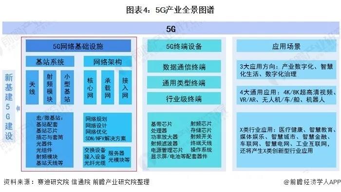 5G产业链条非常之广,含零部件、主设备、运营商和下游应用等环节。前期投入主要包括无线设备、传输设备、基站设备、小基站、光通信设备、网络规划实施等。从应用方向上看,5G应用包括产业数字化、智慧化生活、数字化治理三大方向;5G通用应用(即未来可能应用于各行业各种5G场景的应用)包括4K/8K超高清视频、VR/AR、无人机/车/船、机器人四大类;5G应用到工业、医疗、教育、安防等领域,还将产生X类创新型行业应用。