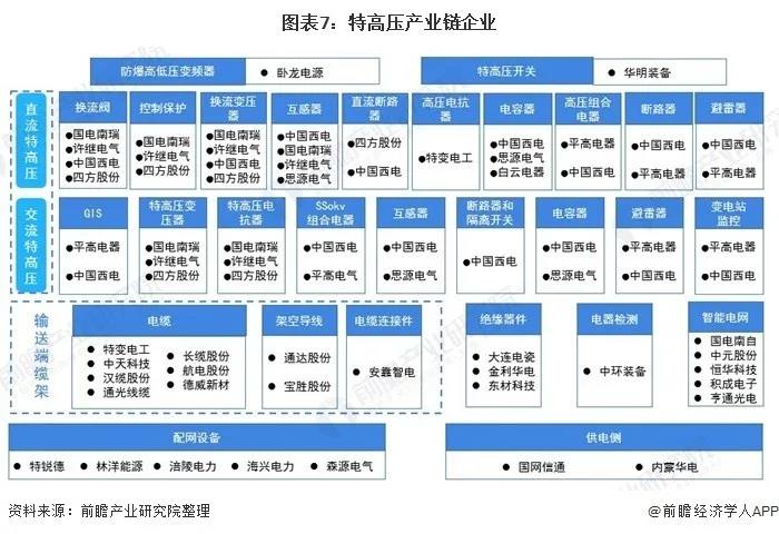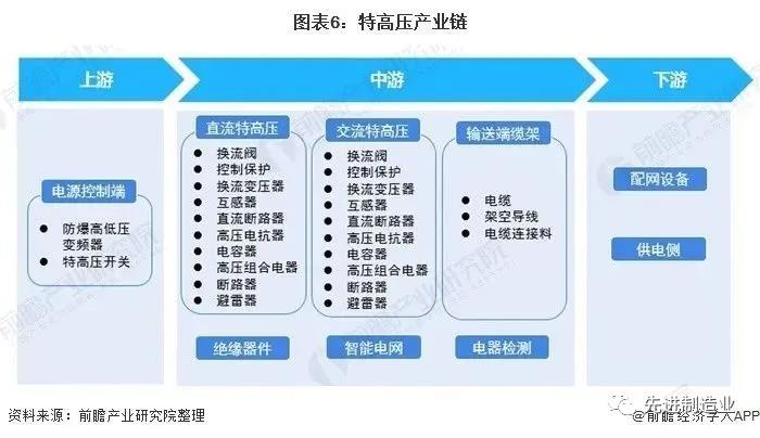 特高压相关产业链可以分为上游的电源控制端、中游的特高压传输线路与设备、下游的配电设备。其中特高压线路与设备是特高压建设的主体,可进一步分为交/直流特高压设备、缆线和铁塔、绝缘器件、智能电网等。