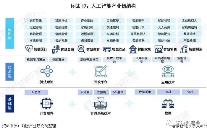 人工智能产业链包括三层:基础层、技术层和应用层。其中,基础层是人工智能产业的基础,为人工智能提供数据及算力支撑;技术层是人工智能产业的核心;应用层是人工智能产业的延伸,面向特定应用场景需求而形成软硬件产品或解决方案。