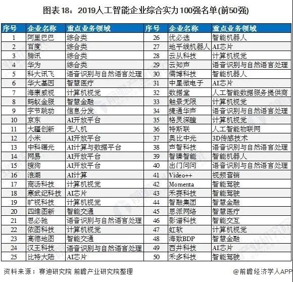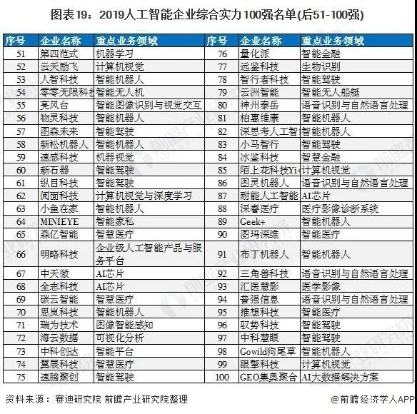 赛迪研究院发布了《2019赛迪人工智能企业百强榜研究报告》。报告从基础指标、企业成长性、创新能力、团队能力四个维度进行定量评比,对700余家中国人工智能主流企业进行定量评估,分别评选出2019人工智能企业综合实力百强、成长能力百强和创新能力百强企业。榜单如下,希望能提供参考意见。