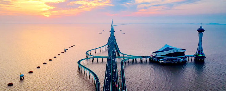 杭州湾跨海大桥于2003年11月14日开工,2008年5月1日建成通车,设计使用寿命100年,总投资134.54亿元。北起嘉兴市海盐枢纽,上跨杭州湾海域,南至宁波市庵东枢纽立交;线路全长36千米,桥梁总长35.7千米。跨海大桥通车后,宁波至上海间的陆路距离缩短了120公里。大桥36公里的长度,在当时在建和已建跨海大桥中位居第一。
