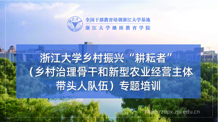 为紧紧围绕实施乡村振兴战略,全面落实《“十四五”推进农业农村现代化规划》《“十四五”农业农村人才队伍建设发展规划》部署要求,以服务乡村振兴为目标,以乡村治理骨干和新型农业经营主体带头人为重点,突出需求导向、实践转化、长期扶持,培养一批与乡村治理现代化相协调,与现代乡村产业需求相适应,能够引领一方、带动一片的乡村治理骨干和新型农业经营主体带头人队伍,浙江大学继续教育学院特开设乡村振兴“耕耘者”(乡村治理骨干和新型农业经营主体带头人队伍)培训班。