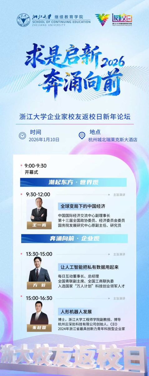 浙江大学企业家校友返校日论坛是由浙江大学继续教育学院主办、浙江大学继续教育学院高管培训部承办的大型高端论坛,致力于提升企业家视野、境界与思维模式,与企业家校友共鸣、共振、共创。校友返校日是为老学员和在读企业家搭建的回校学习交流平台,每年举办1-2次。
